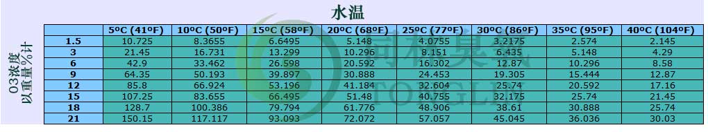 下表顯示了基于水溫和臭氧濃度的臭氧在水中的溶解度(以重量%表示)。這些是業(yè)內(nèi) 很常用的值,并提供了一個(gè)簡(jiǎn)單的參考工具。