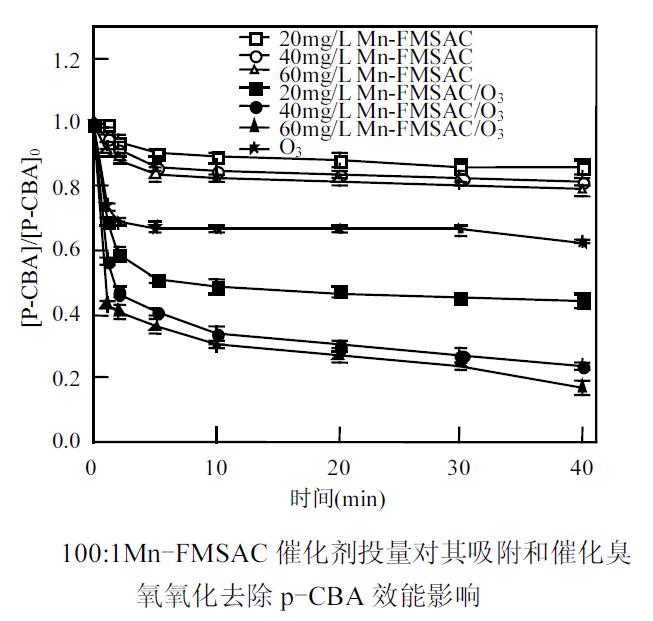 2. 隨著臭氧濃度的增加,100:1Mn-FMSAC 催化臭氧氧化去除p-CBA的效率顯著增強.綜合考慮催化效果及原材料成本,當臭氧投加量為1mg/L 時,催化劑的 很佳投加量為40mg/L.