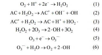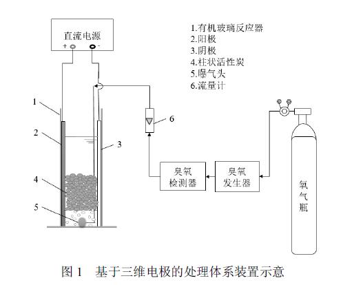 但是常見的二維電極體系,存在電極比表面積小,污染物的降解受傳質限制,處理時間長,電流效率低等缺點.在二維電極間填充活性炭、金屬氧化物等多孔顆粒材料作為粒子電極,可構成三維電極(3D)體系.利用多孔材料的高比面積和吸附能力,可顯著強化污染物的傳質.此外,粒子電極上發生的一系列催化反應,如O2 電化學還原為H2O2(式(1))、H2O2被催化分解產生•OH(式(2)、(3))等,可有效強化系統的氧化能力.在相同的電流條件下,三維電極體系可比二維電極體系提高10%~50%的COD去除率.