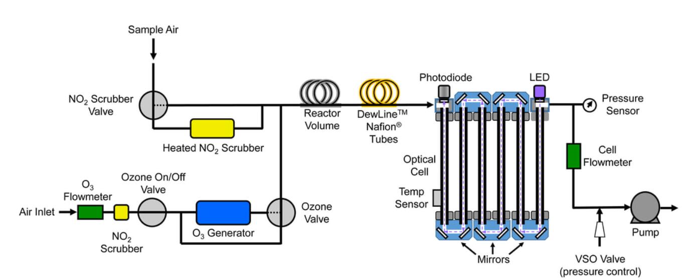 下圖是 美國2B 405 nm NO x 型監視器的簡化示意圖。樣品空氣由氣泵以~1.5 L/min的流速連續吸入儀器。洗滌器閥交替旁路并通過 NO 2 洗滌器發送樣品空氣以去除樣品中的所有 NO 2,從而允許在沒有 NO 2 的 (I o) 和存在 (I) 的 NO2 的情況下測量光強度。然后使用比爾-朗伯定律計算 I和 Io 的 NO 2 濃度。
