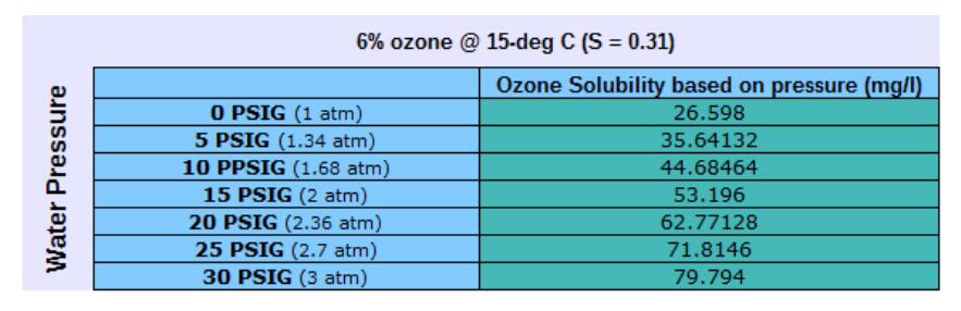 下面的圖表和表格說明了臭氧氣體在水中的溶解度,因?yàn)樗c水的壓力有關(guān)。