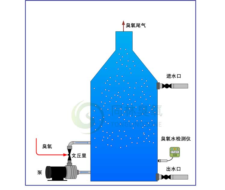 臭氧溶解與泵和文丘里噴射器是簡單的設置和相當有效。由于文丘里管的強力混合作用,這將在槽井中混合水,并比典型的氣泡擴散器實現更高的臭氧向水中的傳質。