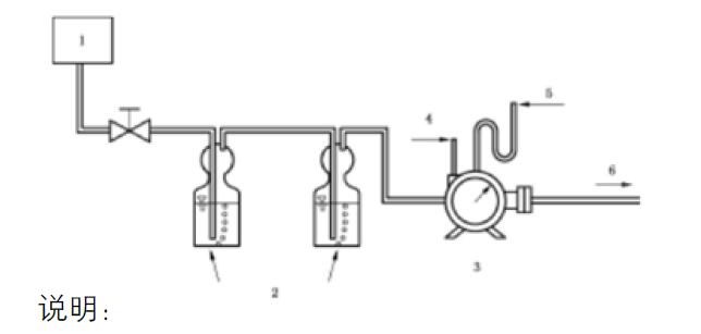B.2.5.2.1 將臭氧化氣的管道插入到空白洗氣瓶中,使用新鮮的臭氧沖洗管道。然后,將臭氧清洗后的管道與測定洗氣瓶連接,并立即使用濕式流量計開始記錄體積。