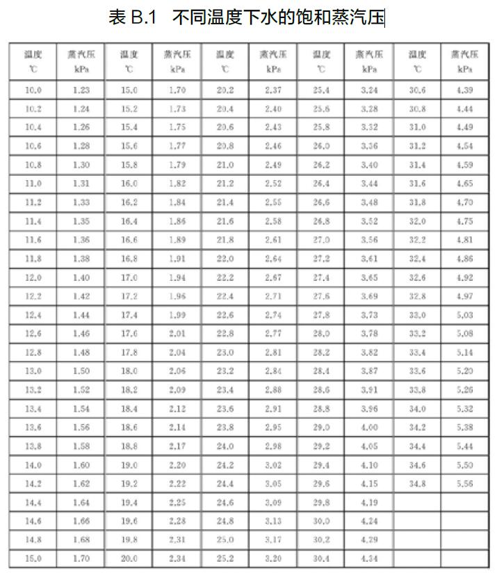 p v —— 飽和水蒸氣壓,單位為千帕(kPa),跟濕式流量計的溫度有關,參見表B.1;